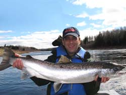![]() Our being located on one of the best Atlantic Salmon rivers in the world is the prime reason that fishing for Atlantic Salmon is our number one activity, with hundreds of guests from around the world returning annually to fly fish the Miramichi for Atlantic Salmon - the "King of Gamefish". The Miramichi also offers good Trout and Striped Bass fishing and we do fish for these two species of gamefish throughout the season. The Atlantic Salmon fishing season runs from April 15th through Oct 15th on much of the Miramichi with prime time for spring Salmon fishing occurring between April 15th and May 15th. In spring, much of the fishing is done from boats - normally one angler to one guide. Much action is experienced at this time of season as the salmon are feeding and good numbers are in the river system. The method used in April is by using sinking lines or sinking tips. In May, depending on conditions, Big streamer flies. Sinking lines, sinking tips & floating lines will also be used with smaller sized streamer flies. We are ideally located for some of the better spring fishing as we are far enough upriver for all the fish to swim by but low enough in the system for them to hold up while entering the tidal waters.