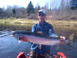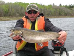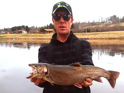 The Trout season runs from May 1st through September 15th on the Miramichi river System, with the most productive time being from May 1st to early July. In May, much Trout fishing is done - similar to Salmon fishing - from boats, with sinking tip streamer flies used mostly in the faster water stretches of the Main River system, but from June into early July, the Cains river is best using 4-7 wt. fly rods and floating lines with dry flies. It is common to catch trout in the system weighing up to 4-5 Lbs.