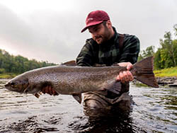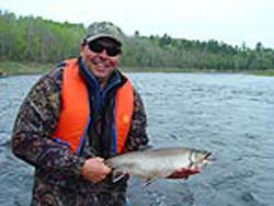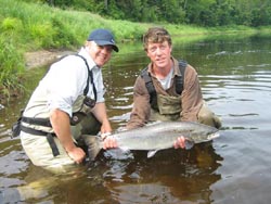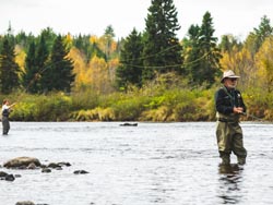 The summer Salmon season starts on June 16th with much of the fishing done by wading, however, boat fishing is still available for those who prefer it to wading. 8-9 wt. rods with floating lines - using both wet and dry flies depending on conditions - is the method used for catching these fresh Wild Atlantic Salmon as they arrive in the system from the sea. In the summer and fall, the Atlantic Salmon are not feeding but take flies out of pure instinct and Salmon up to 30+ lbs. are landed annually on the System. The Miramichi contains a lot of private fishing water so we pride ourselves in offering guests some of the better private water for fishing which produces the best success rate.